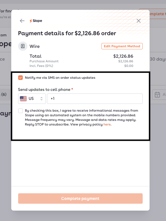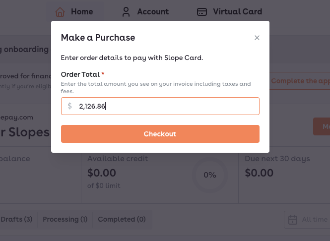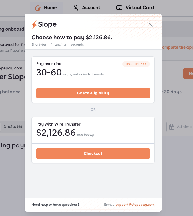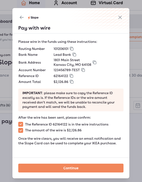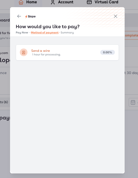 You will receive an email once your wire has been processed and you're able to use your Slope Virtual Card for your purchase. You can find your Virtual Card details within your Slope Buyer Portal here.