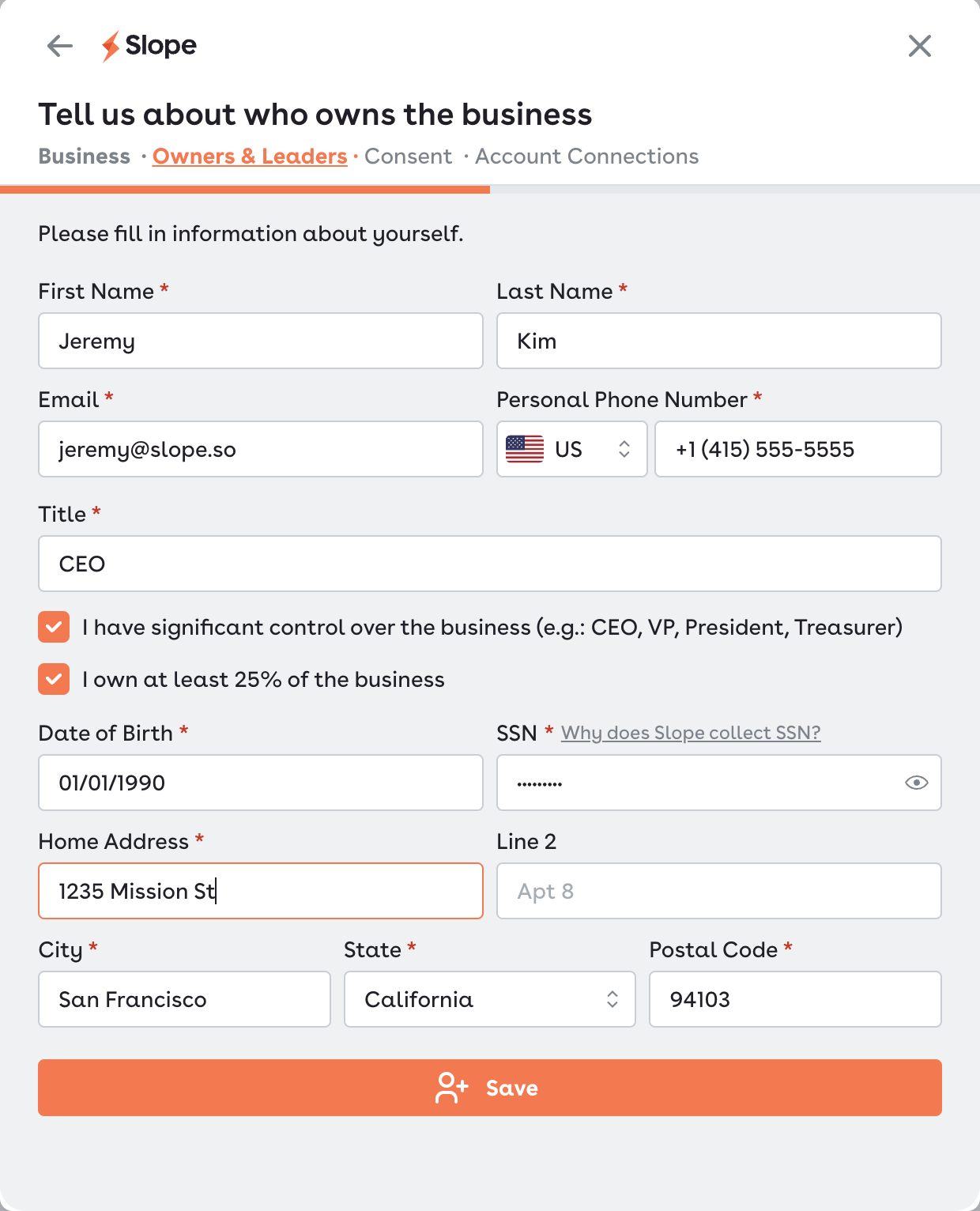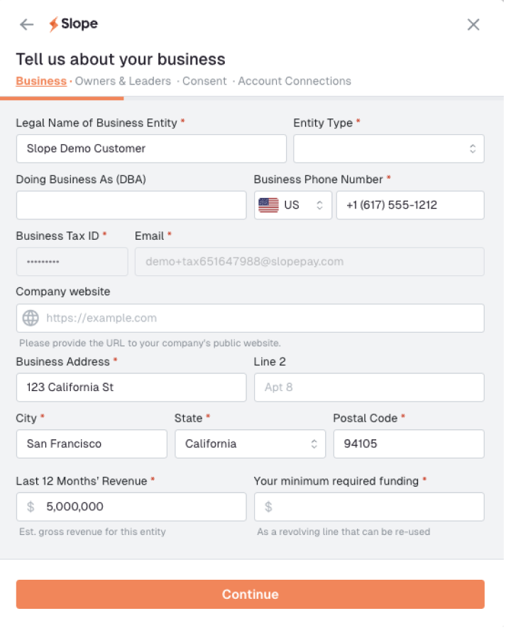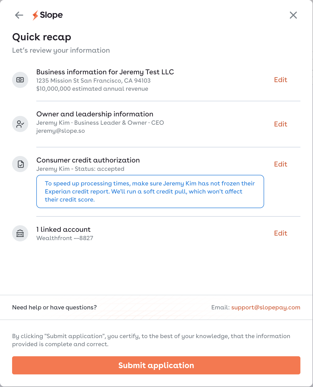 For any questions during the application, contact us at support@slopepay.com. We'll respond with one business day!