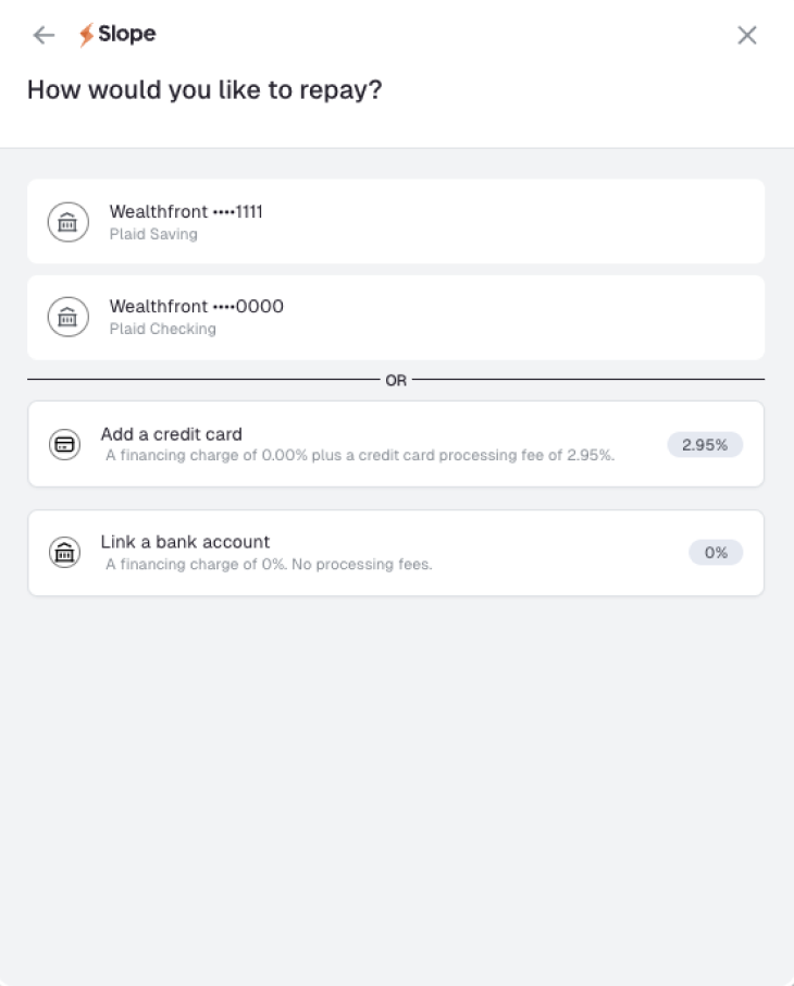 First, choose or add a default repayment method for your future Pay Later for Business orders. We'll automatically charge this method on each due date. You can change this selection later in your Slope portal.