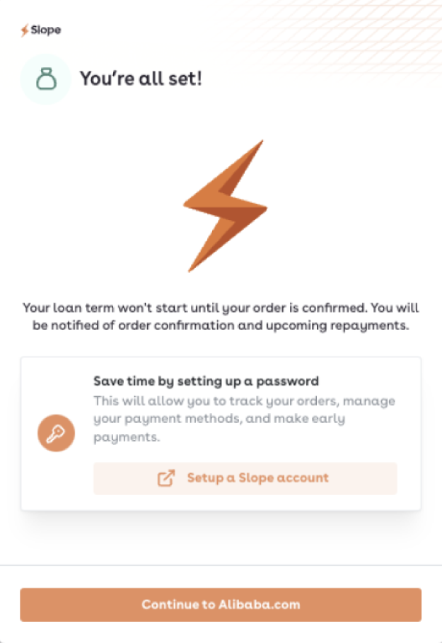 As the last step, set up a password for your Slope account, so that you can easily log in at pay.slopepay.com in the future to view your balance and available limit, upcoming repayments, manage your loans and payment methods, etc.