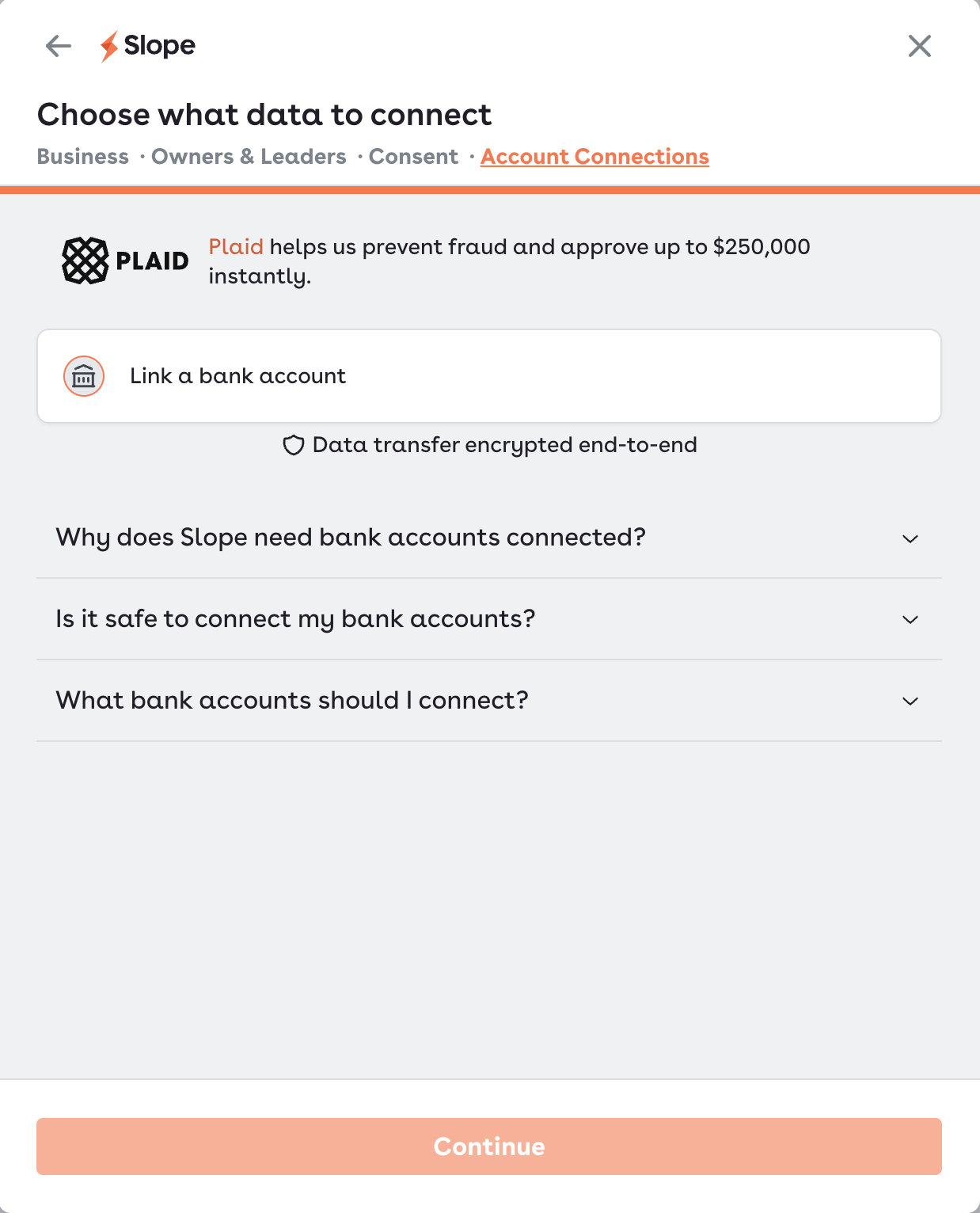 You will then be directed to connect your bank accounts via Plaid. Please connect all your business bank accounts with meaningful transactions. This is key for us to give your the appropriate limit, according to your business financial performance.