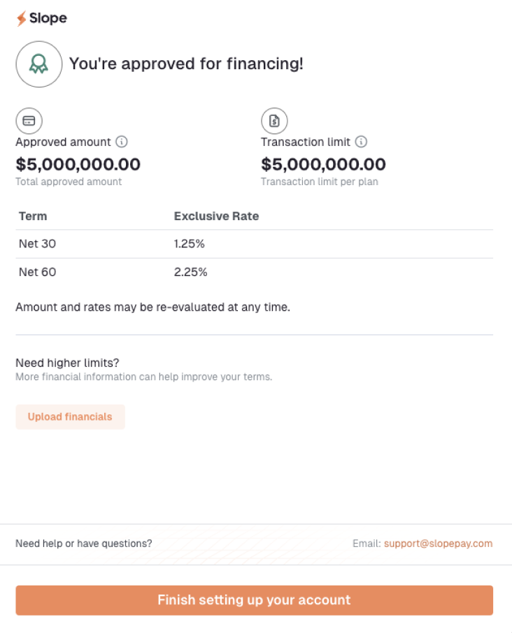 Voila! You'll be notified in seconds whether you're approved, along with your available terms and pricing: